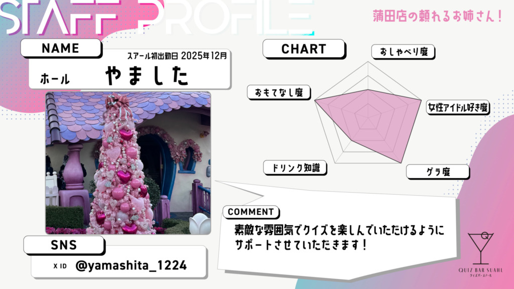 - ホールスタッフが一名つきますので、お酒を作れる必要はありません。