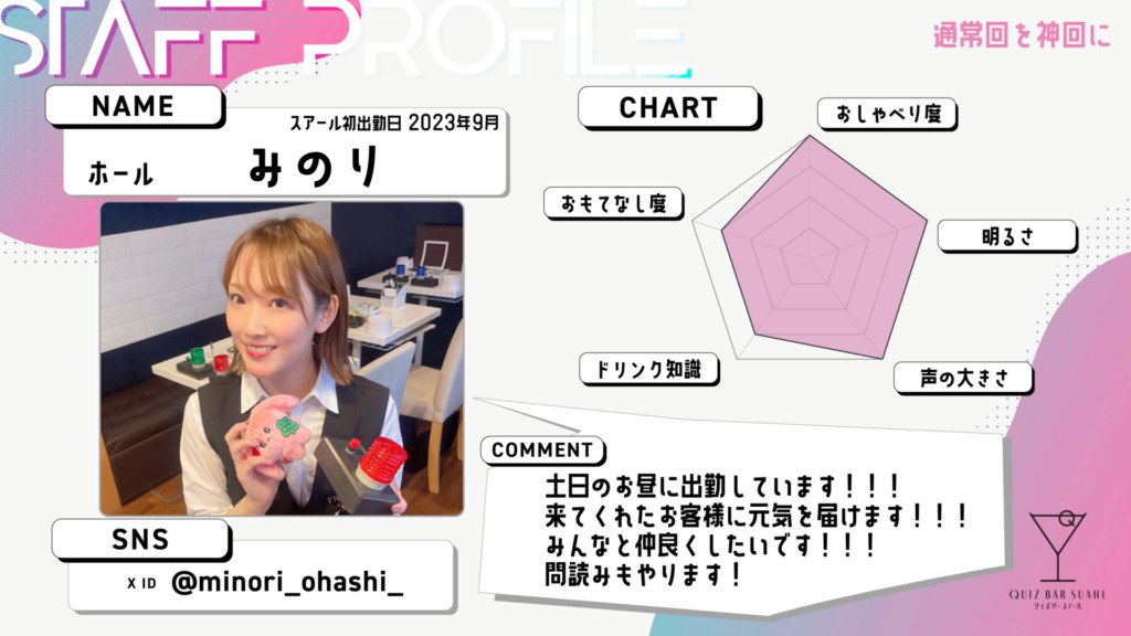 - ホールスタッフが一名つきますので、お酒を作れる必要はありません。